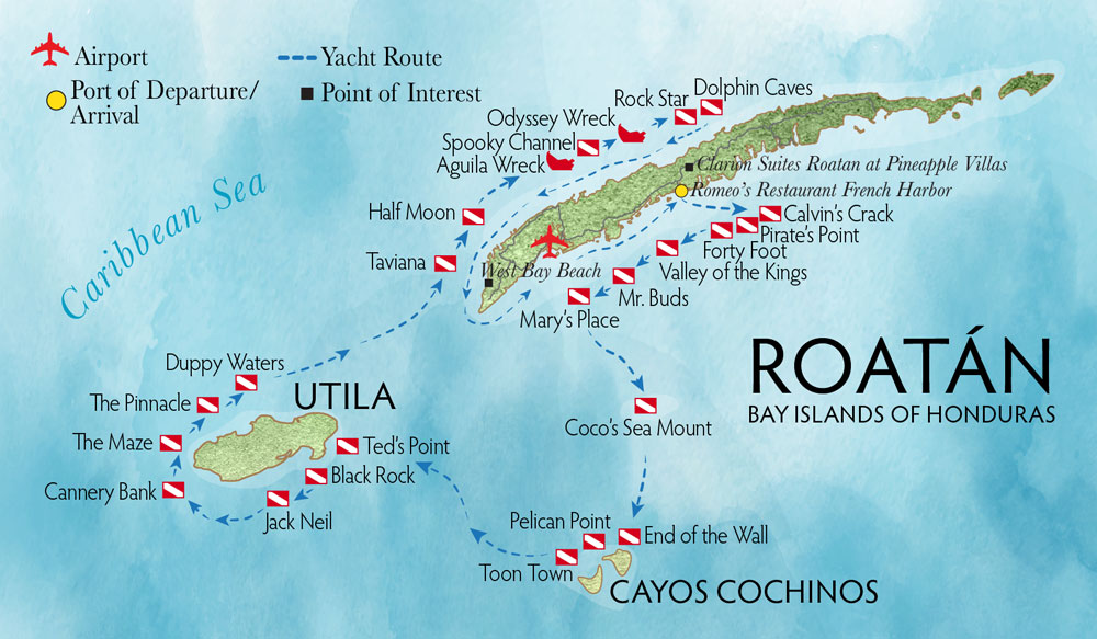 The Roatan Aggressor departs from the dock located at Romeo’s Restaurant in French Harbor, Roatan, for 7-night Saturday to Saturday trips. Guests may board the yacht Saturday between 3:30pm and 6pm. At 6pm the yacht departs for its night anchorage to prepare for diving Sunday morning. Throughout the week you will dive Roatan, Utila and Cayos Cochinos. Up to 27 dives are offered including night dives. After a full week of diving, the yacht returns to the dock at Romeo’s Restaurant Friday after lunch. Friday evening the yacht hosts a sunset cocktail party followed by dinner ashore. Guests then spend a final night on the yacht before checking-out on Saturday morning at 8am.