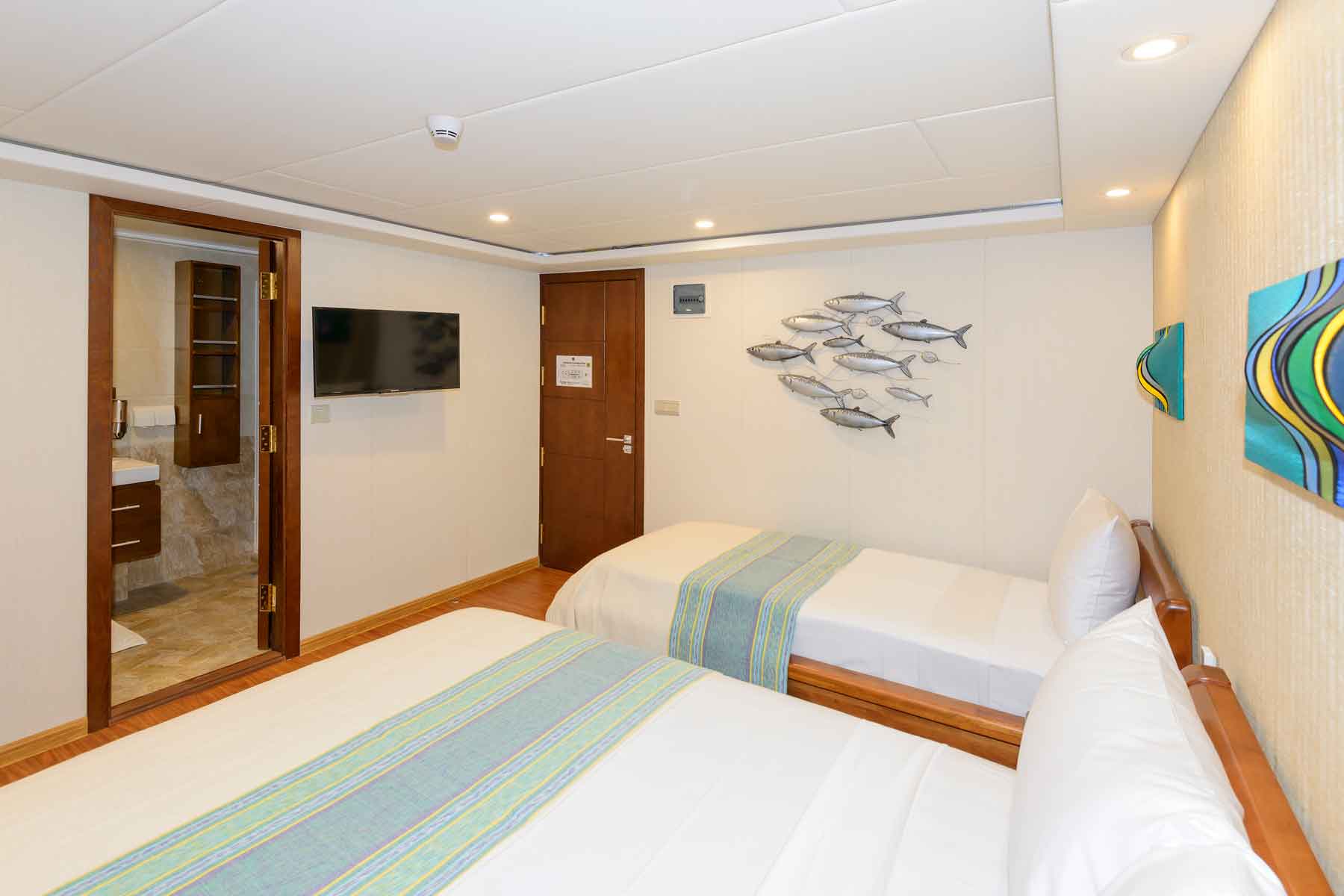 The 4 Junior suites, located on the upper deck have king size (California) beds, a wide flat screen TV connected to central media system, desk/chair/dresser, two hanging closets, windows throughout the side of the cabin, bathroom with large sink and a spacious shower. In two of the Junior suites it is possible to separate the king size bed into two separate beds.