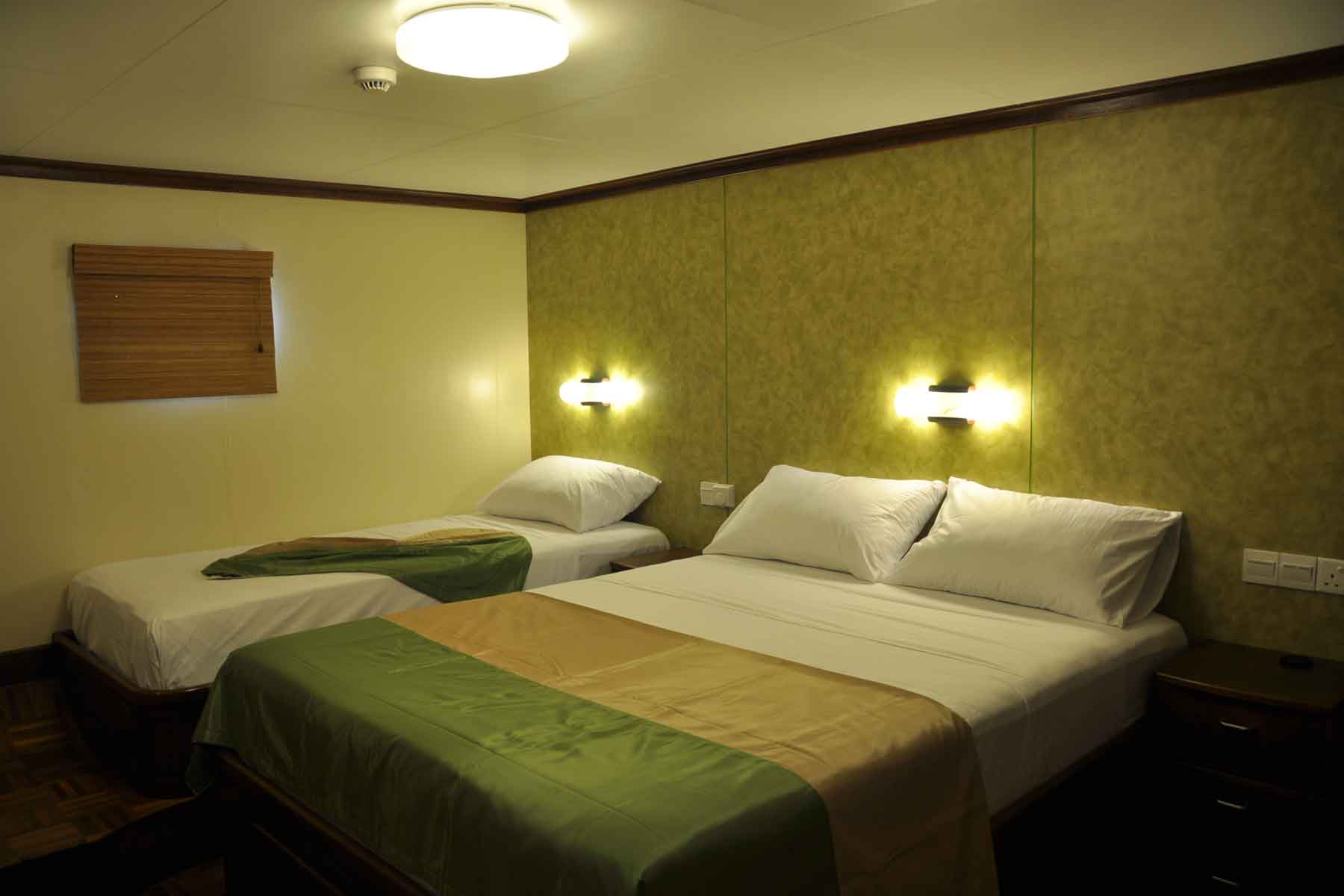 The spacious Suite cabins, located on the upper deck have huge king size beds which can be separated in two super single beds, a wide flat screen TV plus DVD/HD player, desk/chair/dresser, two hanging closets, windows throughout the side of the cabin, bathroom with dual sink and shower cubicle.