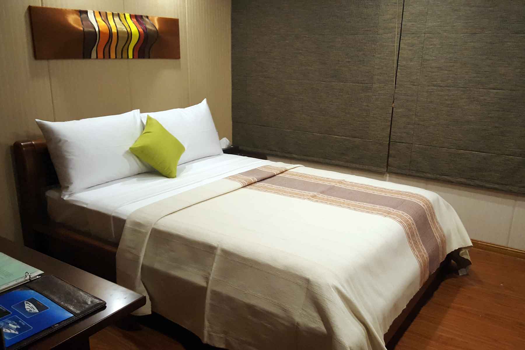 The 2 Single suites, located on the main deck have queen size beds and desk/chair, TV connected to central media system, hanging closet, large windows, private ensuite bathroom and shower.